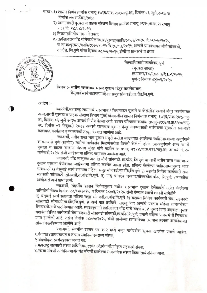 दौंड तालुक्यातील सोनवडी गावाने एक ऐतिहासिक क्षण अनुभवला आहे. संपूर्ण गावाचे लक्ष लागलेल्या व बराच काळ चर्चेत असलेल्या रेशन धान्य दुकानाच्या परवाना प्रकरणात, पुणे जिल्हा पुरवठा अधिकारी श्री. महेश सुधळकर यांनी अखेर निर्णय दिला असून हा परवाना गावातील “येसूबाई स्वयंसहायता महिला समूह, सोनवडी” यांना मंजूर करण्यात आला आहे.